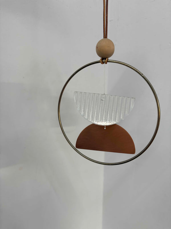 A small, delicate wind chime made with glass, brass, leather and wood, in a studio in Los Angeles.  Makes a nice gentle sound in the wind - this is best...